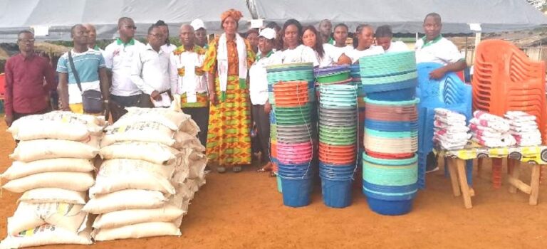Ces présents étaient composés de 150 seaux, 150 cuvettes (bassines), de 50 sacs de riz de 25 kg chacun, de 20 chaises et de 25 complets de pagnes. Ils ont été remis lors d’une cérémonie de remise à l’allure de célébration des femmes des huit villages de la commune de Guiglo, dimanche 1er septembre 2024, dans le village de Glôpaoudy, en présence du maire de Guiglo.
