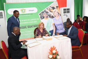 Ce programme, soutenu par la Sodexam, les mines de Tongon et divers partenaires, est parrainé par le cabinet de la Première Dame. Il vise à promouvoir l’intégration des jeunes femmes dans le secteur de l’aviation civile. Jean Louis Moulot, directeur général de la Sodexam, et Tamané Fabrice, directeur général pays de Barrick Gold, holding propriétaire de la société des Mines de Tongon, ont signé à cette occasion un protocole d’accord concrétisant l’effectivité du projet.