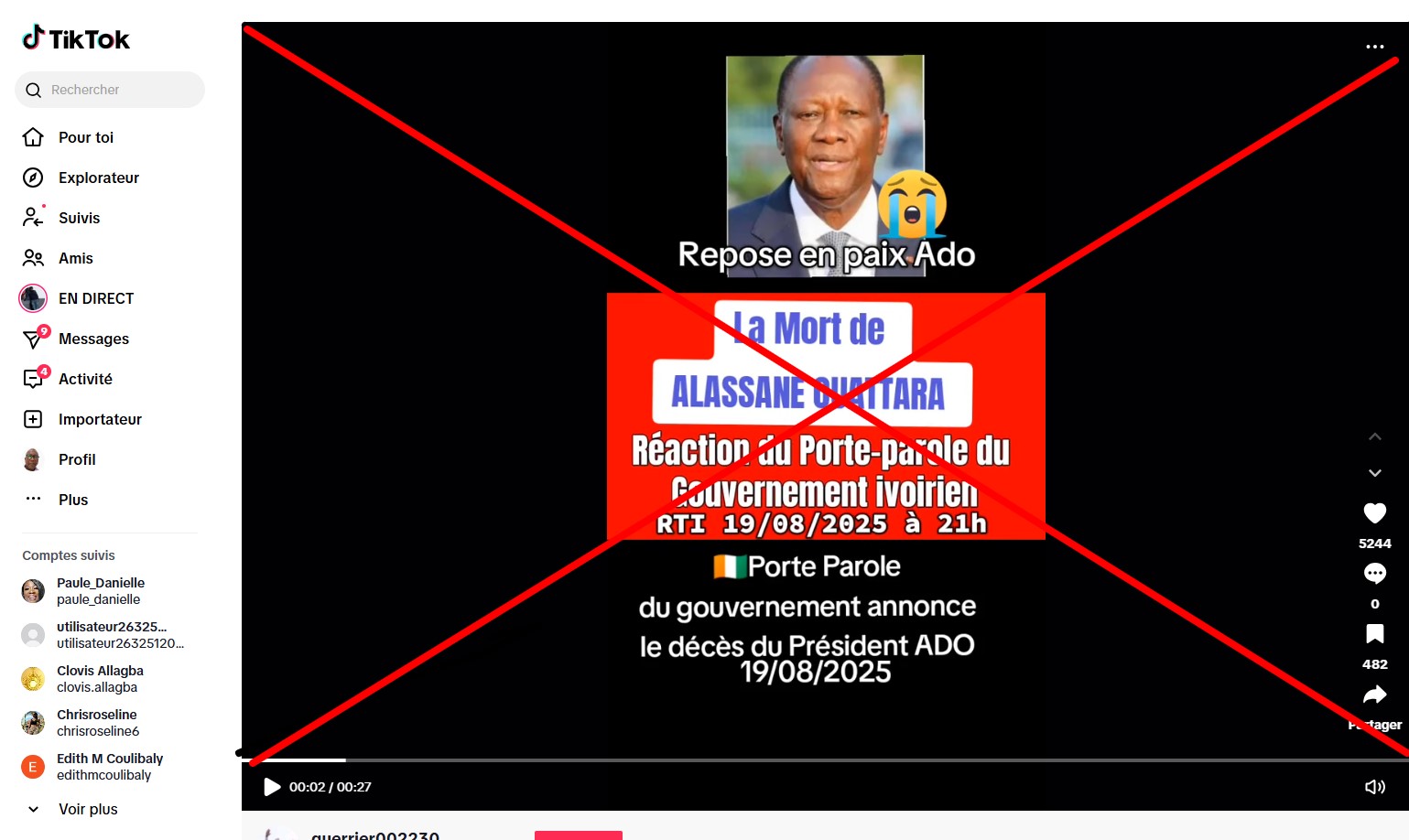 La vidéo de 27 secondes diffusée sur TikTok affirme que le président ivoirien Alassane Ouattara est décédé le 19 août 2025 à 21h. On y lit plusieurs messages de deuil, dont “Repose en paix ADO” et “La mort d’Alassane Ouattara, réaction du porte-parole du gouvernement ivoirien, RTI, le 19 août 2025 à 21 heures”.