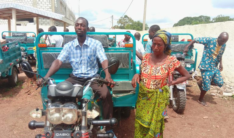 La donation était constituée, outre des tricycles, de sacs de boutures de manioc à haut rendement, de brouettes, de bottes, de machettes, de dabas et de bassines.