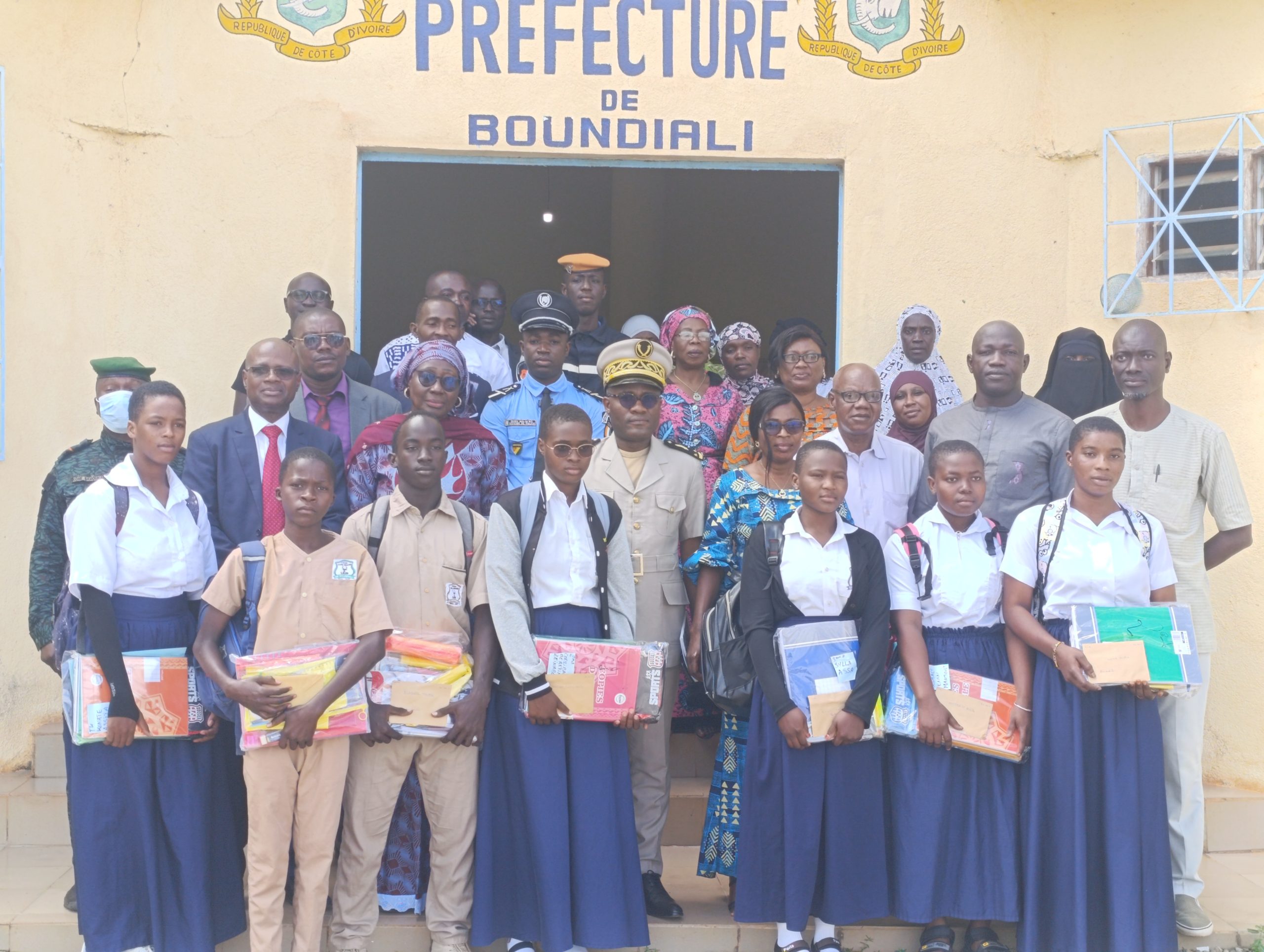 Boundiali, 4 oct 2025 (AIP) – La directrice régionale de la Protection sociale, Karidja Camara, a remis des kits scolaires complets et une enveloppe financière de 620 000 FCFA comme appui substantiel pour leur scolarité, à 11 élèves défavorisés mais méritants de la région de la Bagoué, lors d’une cérémonie officielle à la préfecture de Boundiali.