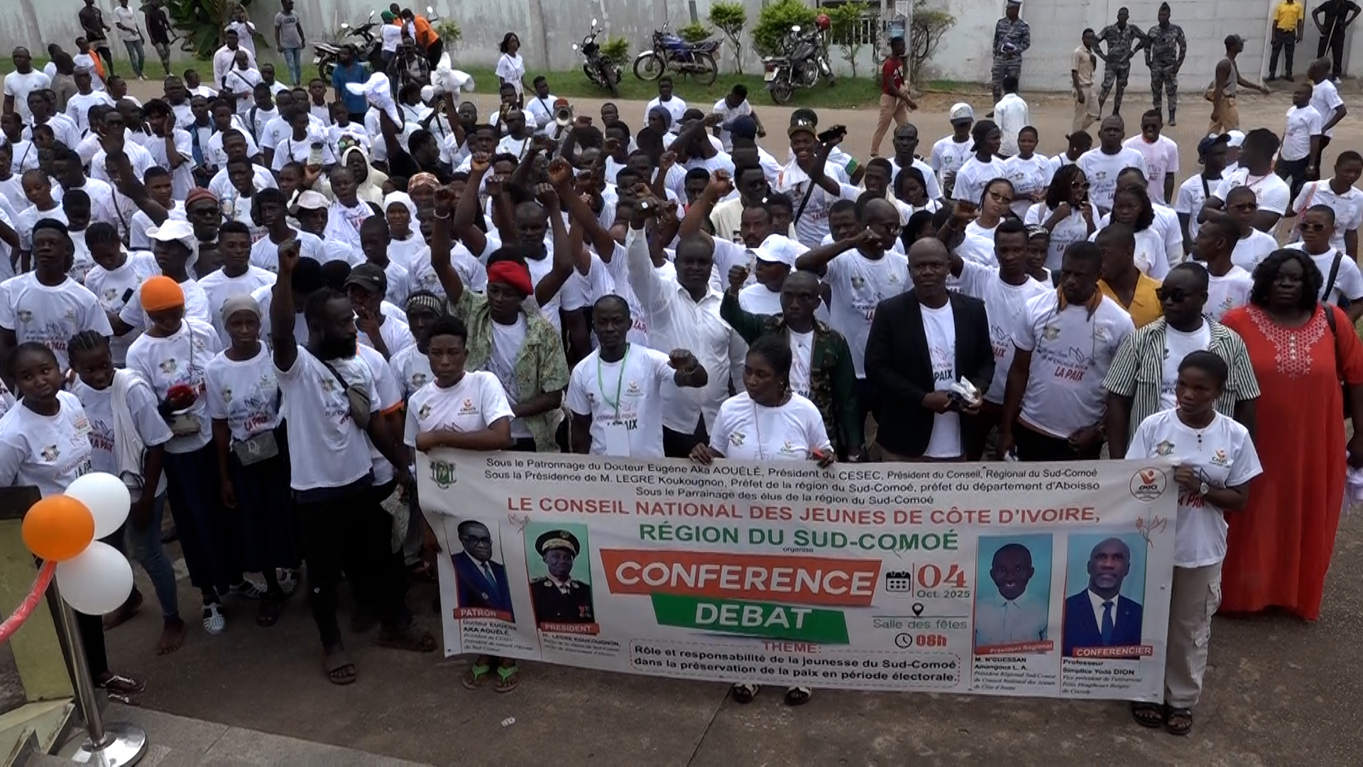 Avant l’ouverture officielle, une marche pacifique conduite par Amangoua Lookensey Aimé, président du CNJCI Sud-Comoé, a sillonné les principales artères de la ville sous le slogan « Je m’engage pour la paix ». Cette mobilisation visait à sensibiliser la jeunesse sur l’importance du refus de la violence en période électorale.