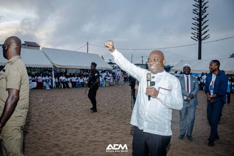 C’est dans une ambiance surchauffée de l’espace gastronomique Saint Louis de Gonzagueville que le candidat Ahoua Don Mello et son équipe de campagne ont été accueillis, mercredi 15 octobre 2025 pour un meeting avec les jeunes et les femmes du quartier.
