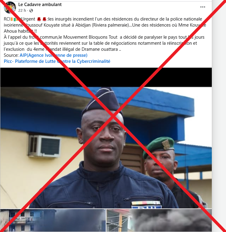 Le dimanche 19 octobre 2025, une publication largement relayée sur les réseaux sociaux, notamment sur Facebook via le compte « Le Cadavre ambulant », a suscité de nombreuses réactions. Le message, présenté comme une alerte urgente, affirme : « RCI Urgent : les insurgés incendient l’une des résidences du directeur général de la police nationale ivoirienne, Youssouf Kouyaté, située à Abidjan, à la Riviera Palmeraie. (…) Une des résidences où Mme Kouyaté Ahoua habitait ! À l’appel du Front commun, le Mouvement Bloquons Tout a décidé de paralyser le pays chaque jour jusqu’à ce que les autorités reviennent à la table des négociations, notamment concernant la réinscription et l’exclusion du 4ᵉ mandat illégal de Dramane Ouattara. Source : AIP (Agence Ivoirienne de Presse) – PLCC, Plateforme de Lutte Contre la Cybercriminalité. »