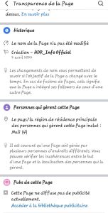 La page Mali Info Universel a, quant à elle, été créée le 9 janvier 2022 sous le nom Fasso Info. Elle a ensuite changé de nom à plusieurs reprises : Mali Info (août 2022) puis Mali Info Universel (septembre 2024). Ces modifications successives laissent entrevoir une volonté d’élargir ou de redéfinir son champ d’action éditorial. Les données de transparence indiquent qu’elle est administrée par deux personnes localisées au Mali. La page compte environ 193 000 abonnés.