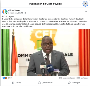 Un post Facebook publié sur la page « Côte d’Ivoire », le 25 octobre 2025, affirme que le président de la Commission Électorale Indépendante (CEI), Ibrahim Kuibiert Coulibaly, a été arrêté à la suite d’une fuite de documents confidentiels présentant les résultats provisoires de l’élection présidentielle.