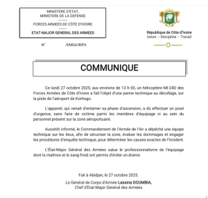 Dans le détail, un communiqué officiel de l’État-major général des armées de Côte d’Ivoire publié, le 27 octobre 2025, explique que, le même jour, aux environs de 13h00, un hélicoptère MI-24D des Forces armées de Côte d’Ivoire (FACI) a subi une panne technique au décollage sur la piste de l’aéroport de Korhogo. L’appareil a effectué « un posé d’urgence, sans faire de victime parmi les membres d’équipage ni au sein du personnel présent sur la zone aéroportuaire ».