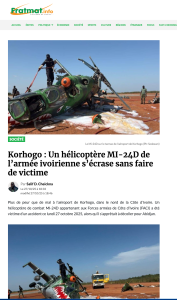 Abidjan, 29 oct 2025 (AIP)- Les publications que nous examinons dans cet article détournent des événements réels survenus en Côte d’Ivoire pour diffuser de fausses informations. Bien qu’un hélicoptère MI-24D se soit écrasé à l’aéroport de Korhogo, le 27 octobre 2025, aucune attaque liée à une insurrection contre les autorités n’est à l’origine de l’incident.