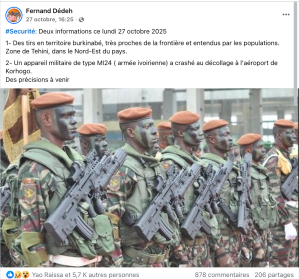 Le même jour, le 27 octobre 2025, le journaliste ivoirien Fernand Dédeh a rapporté sur Facebook que des tirs ont été entendus en territoire burkinabé, à proximité de la frontière ivoirienne, dans la zone de Téhini (Nord-Est). Il a rapporté cette information en même temps que le crash de l’hélicoptère de MI-24D de l’armée ivoirienne. Ces deux informations évoquant le domaine de la défense et de la sécurité ont pu alimenter des craintes et fake news sur les réseaux sociaux.
