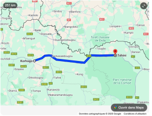 D’après les données cartographiques de Google en 2025, environ 250 kilomètres, pour quatre heures de route en voiture, séparent les localités de Korhogo et Téhini.