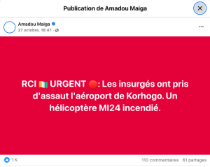 En Côte d’Ivoire, les résultats provisoires de l’élection présidentielle tenue le 25 octobre 2025 ont été publiés par la Commission Électorale Indépendante (CEI), le 27 octobre 2025. Le Président sortant Alassane Ouattara, candidat à sa propre réélection, a été élu provisoirement après avoir obtenu 89,77 % des voix. Le même jour où ces résultats provisoires ont été proclamés, une publication du compte Amadou Maiga, suivi par plus de 72 000 abonnés, a affirmé : « URGENT : Les insurgés ont pris d’assaut l’aéroport de Korhogo. Un hélicoptère MI-24 incendié. »