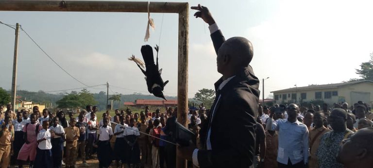 L’oiseau était attaché avec un fil de fer et un morceau de tissu blanc, puis accroché à la barre transversale de l’un des poteaux du terrain de football. Informée, l’administration du lycée a immédiatement alerté les autorités coutumières de la localité. Après vérification des faits, le corbeau a été détaché, tué puis enterré par un enseignant.