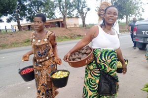 Galé Mireille, mère célibataire de trois enfants, a suivi les pas de sa mère, autrefois vendeuse d’escargots au carrefour. Elle écoule sa marchandise auprès des voyageurs en véhicules particuliers ou dans les cars de transport qui marquent une escale sur ce site.