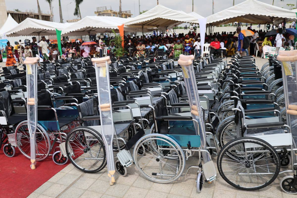 Ces équipements comprennent 1 000 fauteuils roulants orthopédiques, 20 fauteuils roulants électriques, 500 paires de béquilles, 200 cannes blanches, 100 ramettes de papier braille, 5 tonnes de riz ainsi que divers produits de protection solaire destinés aux personnes albinos.