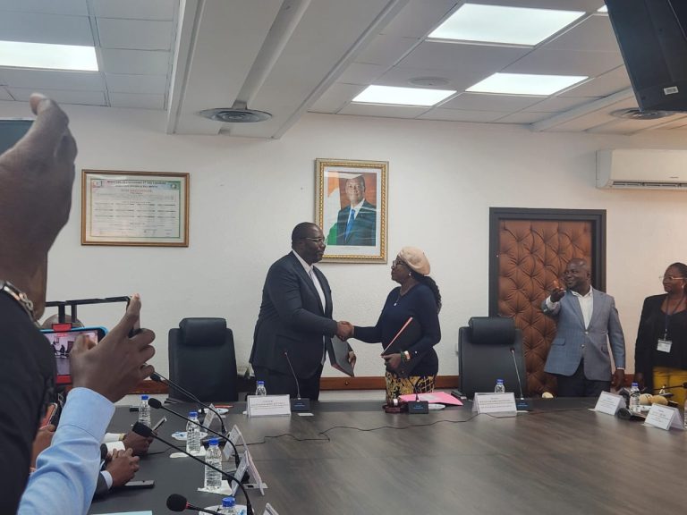 Abidjan, 18 déc 2025 (AIP) – La directrice générale adjointe des Impôts, Dr M’Bahia Maférima, et le directeur général du Guichet unique du commerce extérieur de Côte d’Ivoire (GUCE-CI), Kitifolo Kignaman-Soro, ont signé le jeudi 18 décembre 2025, à la salle de conférence de la direction générale des Impôts (DGI), à Abidjan Plateau, un protocole d’accord en vue de la sécurisation des recettes de l’État et de l’élargissement de l’assiette fiscale.