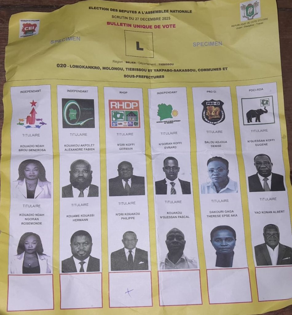 Tiébissou, 23 déc 2025 (AIP) – Six listes, issues de deux partis politiques et de quatre candidatures indépendantes, briguent les deux sièges de député de la circonscription électorale 020 de Tiébissou, en prélude au scrutin législatif prévu le 27 décembre 2025.