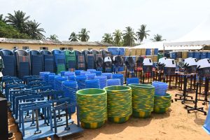 Les dons en matériels ont concerné plusieurs secteurs d’activités féminins et juvéniles. Ainsi, les coiffeuses ont reçu 20 casques de coiffure, 20 lave-têtes et 20 meubles de rangement, tandis que les couturières ont bénéficié de 20 machines à coudre.