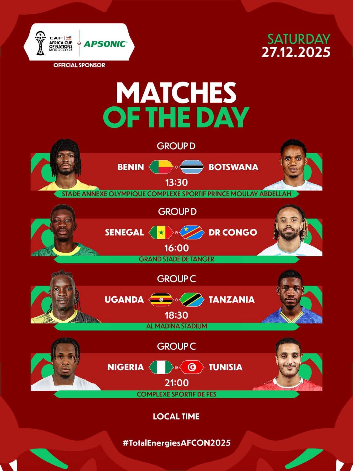 Maroc, 27 déc 2025 (AIP) – La deuxième journée de la phase de groupes de la Coupe d’Afrique des Nations (CAN) TotalEnergies 2025 se poursuit samedi 27 décembre 2025 avec plusieurs rencontres décisives dans les groupes C et D, sur différents stades du Royaume du Maroc.