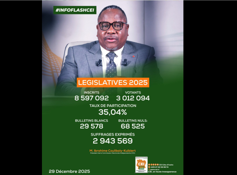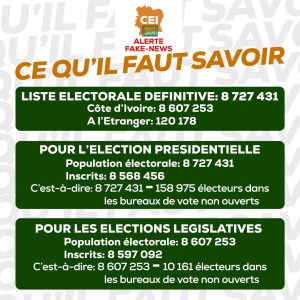 En revanche, dans le cadre des élections législatives du 27 décembre 2025, la CEI a publié sur sa page Facebook un nombre d’inscrits de 8 597 092 électeurs. Ce chiffre a été repris par le président de la CEI, Ibrahime Coulibaly Kuibiert, dans une vidéo diffusée sur la page Facebook de la RTI 1, à la 1re minute 45 secondes, lors de la proclamation des résultats provisoires.