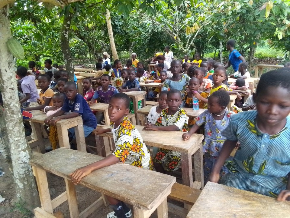 Quelques semaines plus tard, l’école naît là où les enfants travaillaient. Entre les rangées de cacaoyers, des bancs remplacent les paniers de récolte. « Je ne voulais pas que l’école soit loin, alors je l’ai amenée jusqu’à eux ici dans les champs », explique le pasteur, précisant que l’objectif est d’offrir une éducation sans priver les parents de leur travail et transformer le destin des enfants.