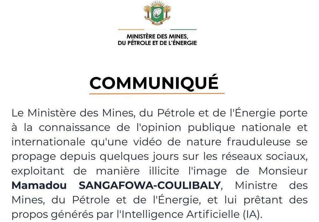 Abidjan, 05 fév 2026 (AIP)— Le ministère des Mines, du Pétrole et de l’Énergie a alerté, le jeudi 05 février 2026, l’opinion publique nationale et internationale sur la circulation, depuis quelques jours sur les réseaux sociaux, d’une vidéo frauduleuse exploitant illicitement l’image du ministre Mamadou Sangafowa-Coulibaly.