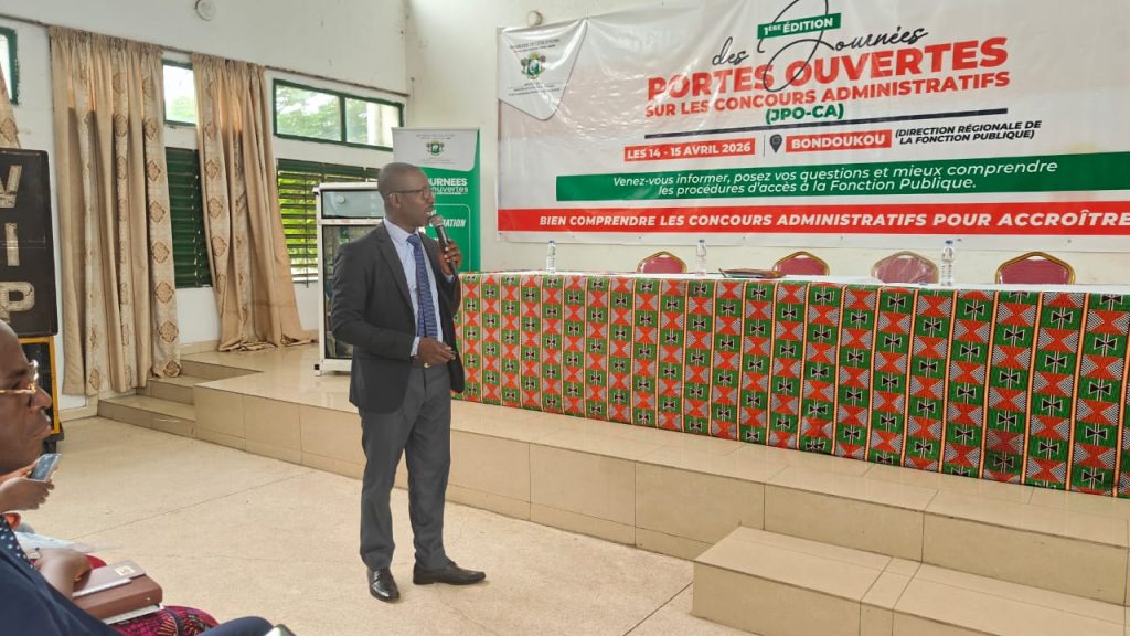 Bondoukou, 15 avr 2026 (AIP) – Le directeur régional de la Fonction publique du Gontougo, Etchien Morandjo Esaïe, a réaffirmé mardi 14 avril 2026 à Bondoukou, son engagement à garantir un accès équitable aux emplois publics, fondé sur les principes de transparence, d’équité et de mérite, à l’occasion de l’ouverture de la première édition des Journées portes ouvertes sur les Concours administratifs (JPO-CA).