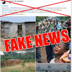 La publication diffusée par la page « Cauchemar des apatrides » s’inscrit dans une logique de désinformation. En recyclant des images de violences anciennes survenues à Duékoué en 2011 et 2012, ainsi qu’un cliché pris en République démocratique du Congo en 2022, elle tente d’accréditer à tort l’existence d’une crise sécuritaire actuelle en Côte d’Ivoire.