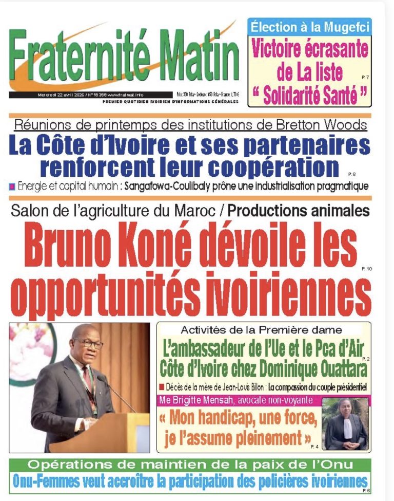 Le traitement économique domine largement les Unes, avec un accent sur la présence ivoirienne au Salon de l’agriculture au Maroc. « Salon de l’agriculture du Maroc / Productions animales : Bruno Koné dévoile les opportunités ivoiriennes », titre Fraternité Matin, qui évoque également le « printemps des institutions de Bretton Woods », marqué par un renforcement de la coopération entre la Côte d’Ivoire et ses partenaires.