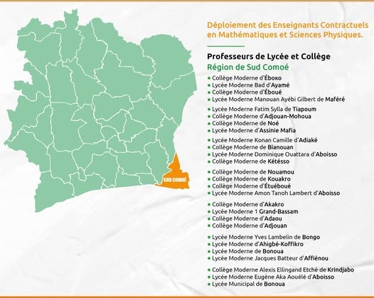 Selon une publication en date du vendredi 24 avril 2026, ces enseignants ont été affectés dans des lycées et collèges situés notamment à Aboisso, Bonoua, Grand-Bassam, Adiaké, Maféré, Tiapoum et Assinie.