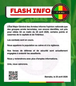 Abidjan, 25 avr 2026 (AIP) – Des groupes armés qualifiés de « terroristes » par l’armée ont mené, samedi 25 avril 2026 à l’aube, des attaques coordonnées contre plusieurs positions militaires dans la capitale Bamako et dans différentes localités du Mali, selon des sources sécuritaires et des témoignages concordants.